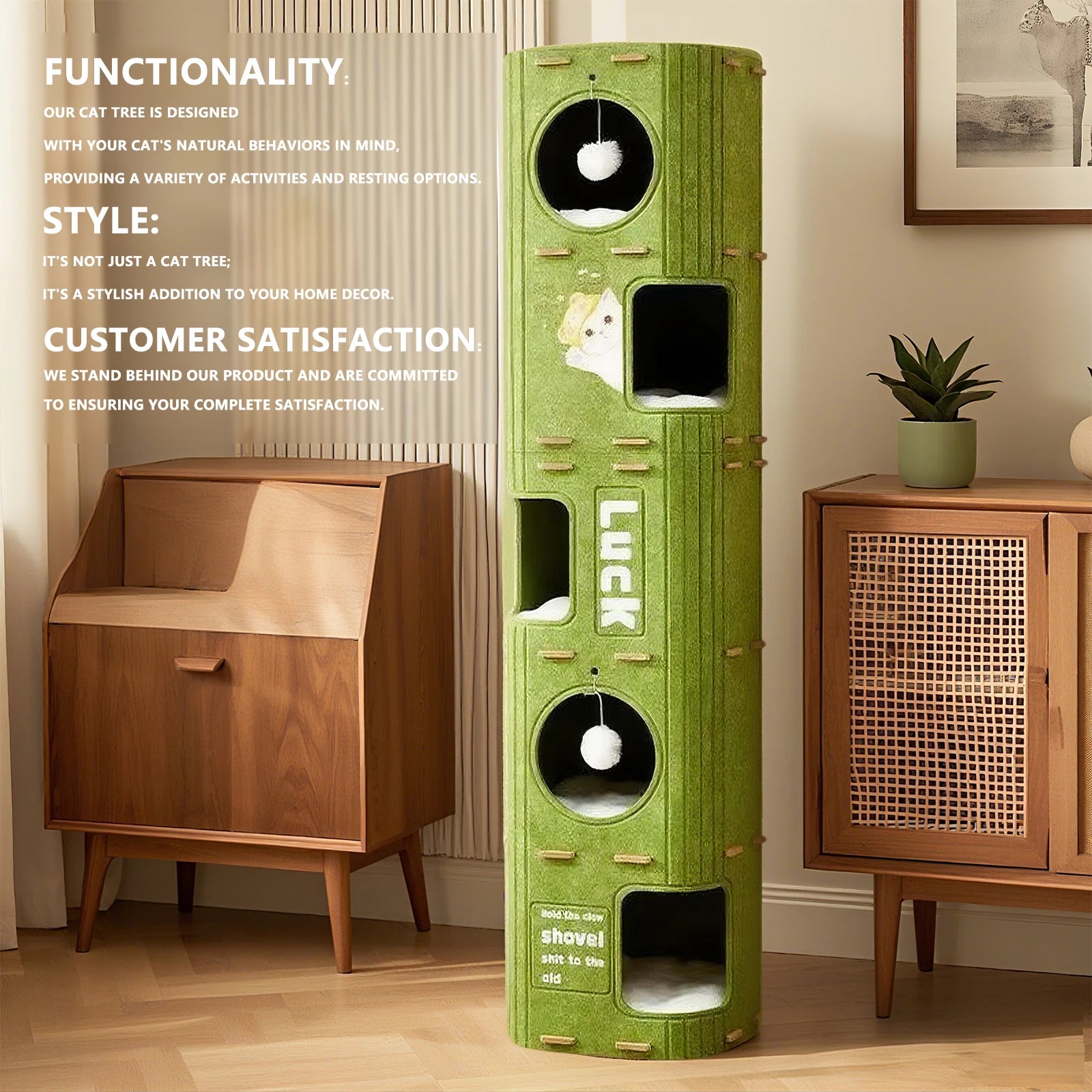 Green cat playhouse with a cat inside, featuring text about durability and assembly. Purr fect Felt Forest Tower -  Accessory - JBCoolCats